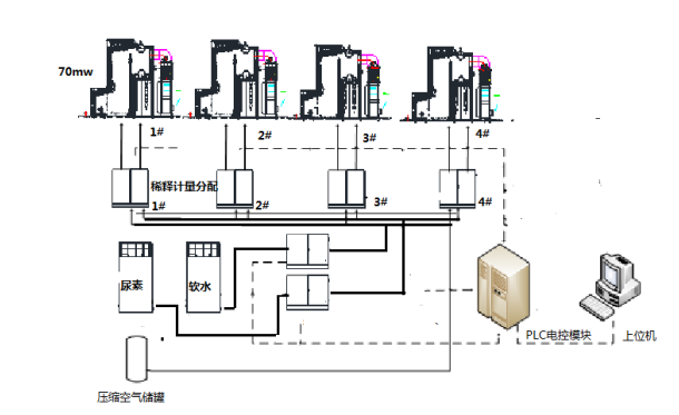 尿素溶液經(jīng)配制并儲(chǔ)存后,由在線稀釋系統(tǒng)根據(jù)鍋爐運(yùn)行情況和NOx排放濃度情況在線稀釋成所需的噴射量,送入噴射系統(tǒng)。噴射系統(tǒng)實(shí)現(xiàn)各噴射層的尿素溶液分配、霧化噴射和計(jì)量,還原劑的供應(yīng)量能滿足鍋爐不同負(fù)荷的要求。整套電氣控制系統(tǒng)調(diào)節(jié)方便、靈活、可靠,在設(shè)備間、爐房噴點(diǎn)現(xiàn)場及控制室均能聯(lián)動(dòng)控制。鍋爐脫硝整體工藝流程如下: